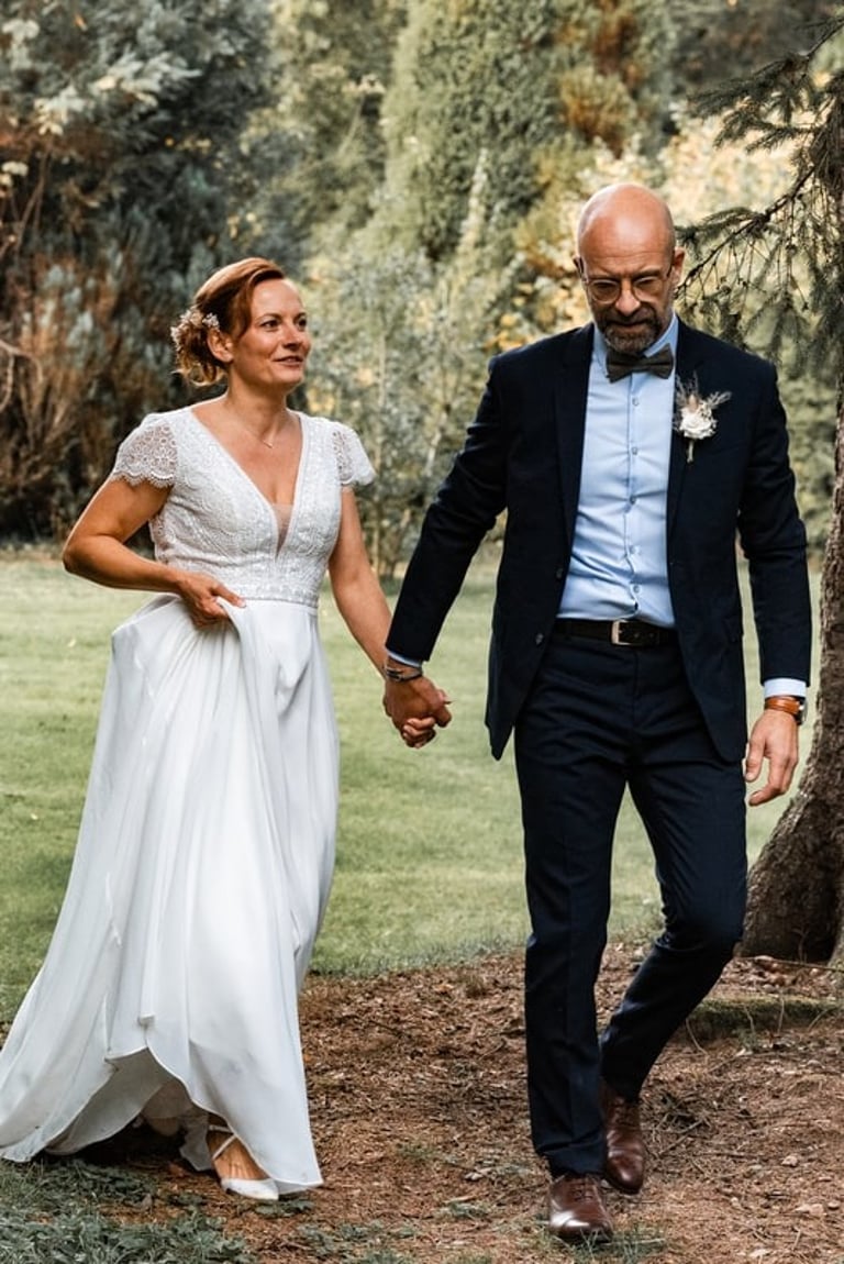 Ils adorent chiner, fouiller les brocantes de la région, et leur maison respire le bon goût, avec une décoration mêlant objets vintage et pièces uniques. Un style qui collait parfaitement à leur mariage bohème–champêtre.