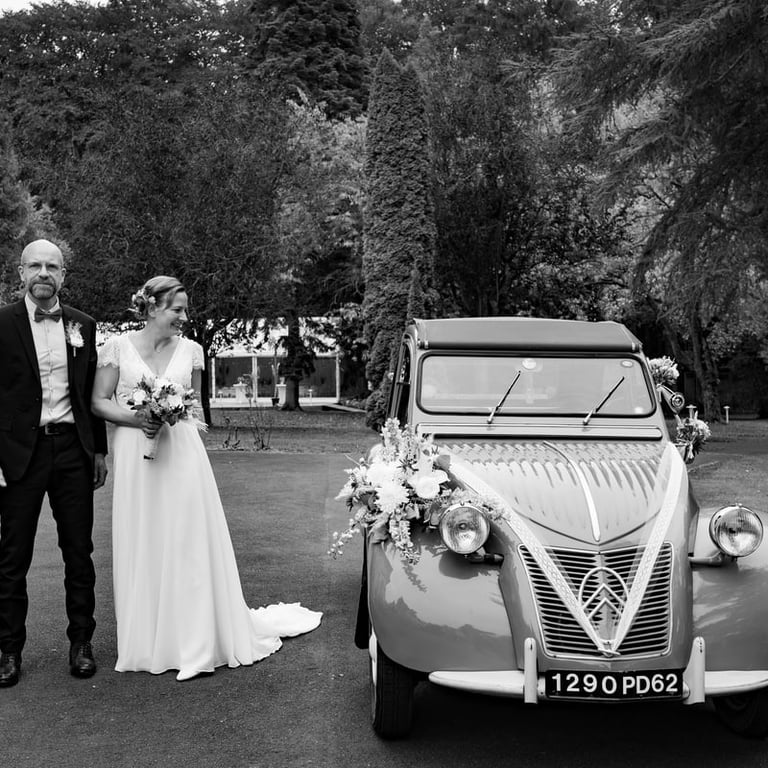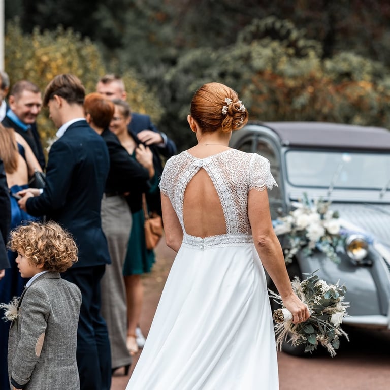 Ce jour-là, une magnifique Citroën 2CV de 1954 attendait les mariés à la sortie de la mairie — un vrai cadeau-surprise. Leur arrivée au domaine a même donné lieu à une photo de groupe improvisée devant l’entrée.