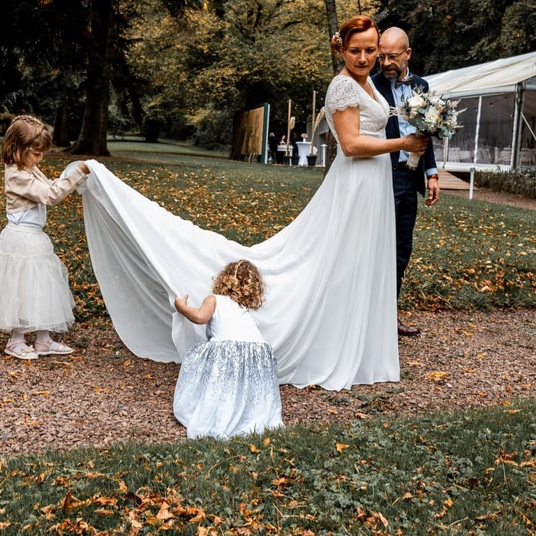 Les mariés, Sandrine et Matthieu, m’ont confié la réalisation du reportage photo de leur journée d’union. Leur histoire est celle d’une tribu recomposée, une famille pleine de vie, de bienveillance et de sensibilité. Vous savez, ces rencontres où l’on se dit : “Ces gens-là sont vraiment formidables” ? Eh bien, c’est exactement l’impression qu’ils m’ont laissée.